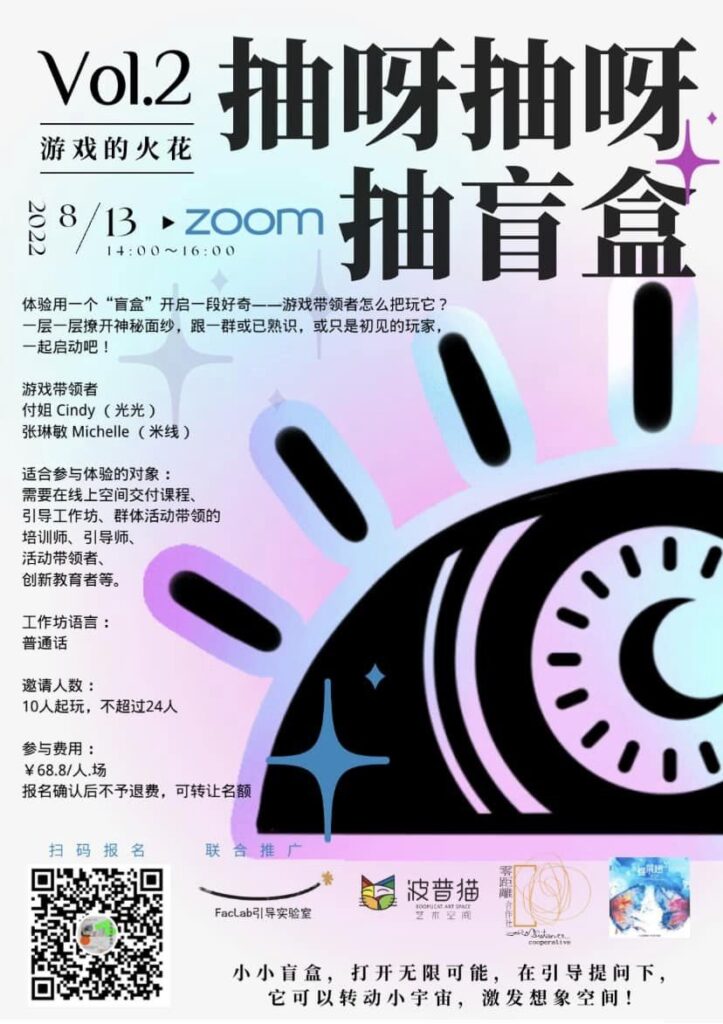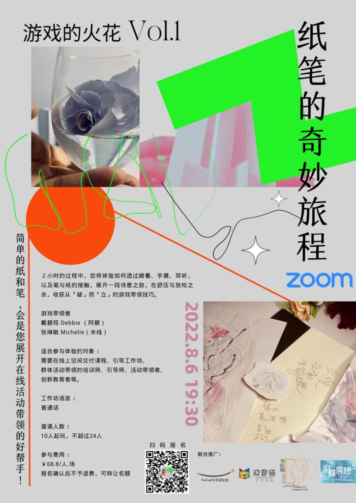 引導實驗室FacLab® 發起者。國際引導師協會( IAF)認證專業引導師(CPF)、輔導員(Mentor),連續兩年全球女性職業輔導項目(The Link Mentorship Program)輔導員 ( Mentor),國際災難支援公益機構國際引導師服務機構( Global Facilitators Service Corps. GFSC)志願引導師。自2018年實踐遊戲化的精神,將其運用在培訓、引導、活動帶領中。擅長以引導作為承托,在探索團隊交流、協同合作、即興戲劇、線上遊戲活動等不同的場景之下以 “yes adn”的即興精神將當下的呈現作為團體的學習體驗進行深化。在引導實驗室 FacLab 的平臺曾組織《虛擬引導活動設計》、《線上遊戲安全空間》、《虛擬引導開場遊戲》、《原型測試 | 玩家招募 Miro 遊戲同耍》等不同形式的遊戲活動。