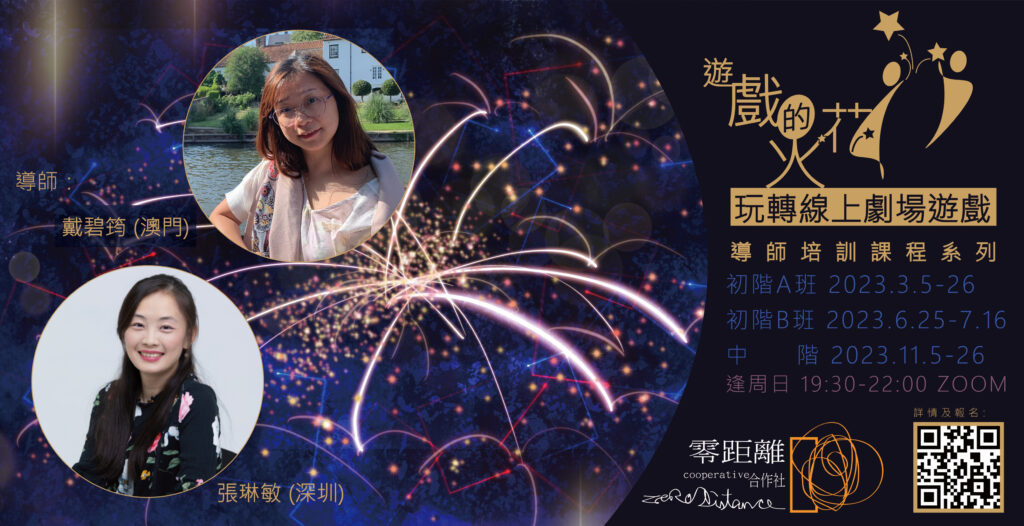 2021年零距離合作社回應疫情下的教育需求,與深圳引導實驗室FacLab合作,由資深劇場導師戴碧筠與國際認證引導師張琳敏系統地將劇場遊戲、Zoom空間及引導相結合設計到課程中,開辦面向中國大陸劇場表演者、創意導師與引導師為對象的線上培訓課程,獲得參加者高度評價及認同回饋,歷經一年半的觀察、思考和打磨,2023年繼續開辦以廣東話為授課語言的「遊戲的火花 | 玩轉線上劇場遊戲」導師培訓課程系列,以及以普通話為授課語言的「遊戲的火花V2.0 | 玩轉線上遊戲」導師培訓課程系列為澳門及鄰近地區拓展交流、戲劇應用和線上教學,儲備資源。